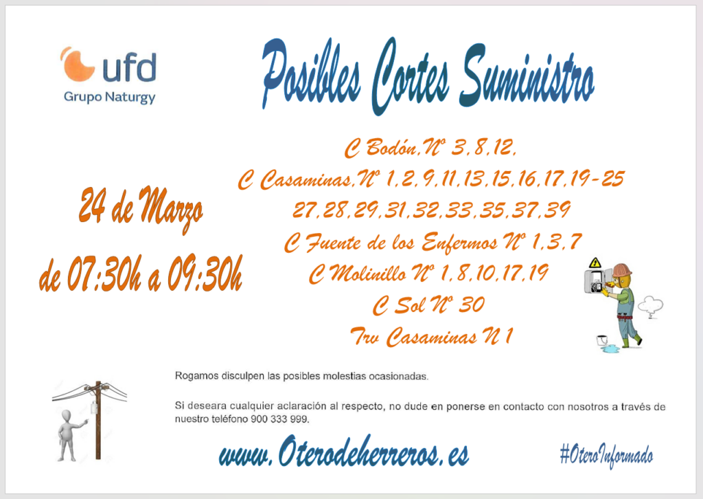 Nos informan de posibles interrupciones en el suministro eléctrico el día 24 de Marzo de 7:30h a 9:30h en algunas calles del
