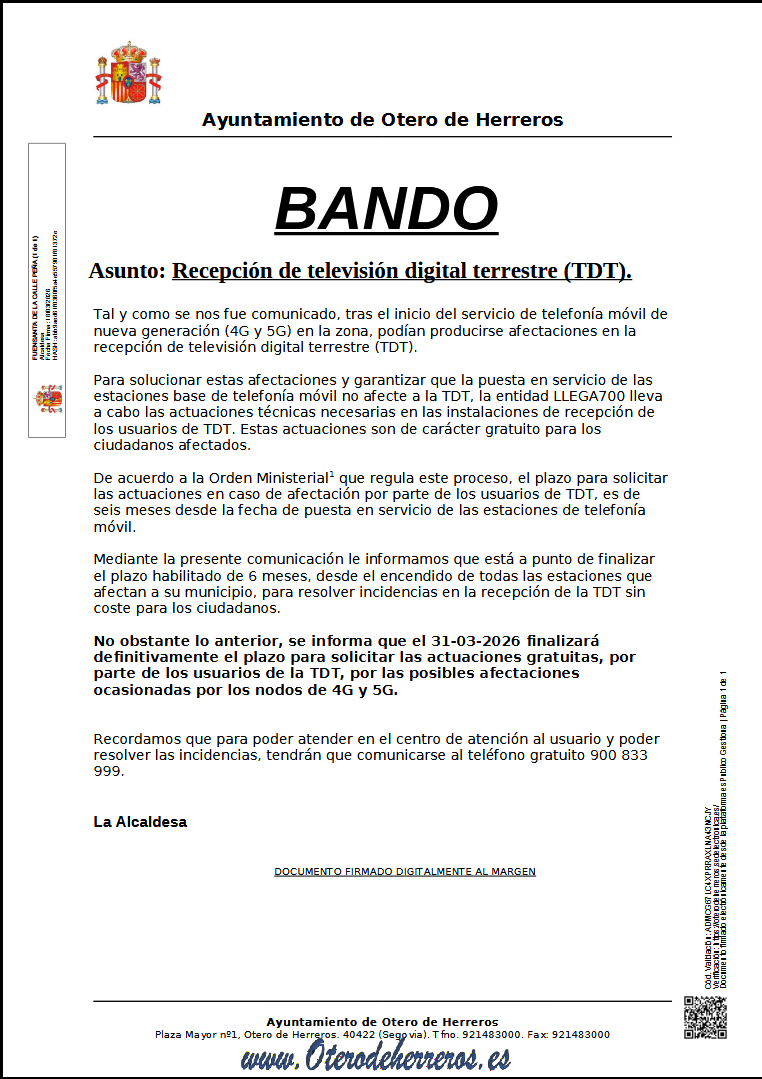 BANDO Asunto: Recepción de televisión digital terrestre (TDT).Tal y como se nos fue comunicado, tras el inicio del servicio de telefonía móvil de nueva generación (4G y 5G) en la … Leer más