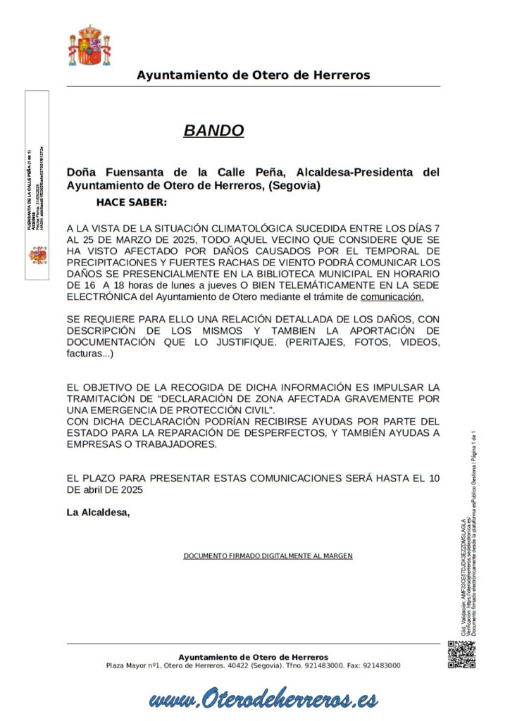 Todo vecino que considere que se ha visto afectado podrá comunicarlo presencialmente en la biblioteca municipal o telemáticamente en la sede electrónica del ayuntamiento de Otero de Herreros.