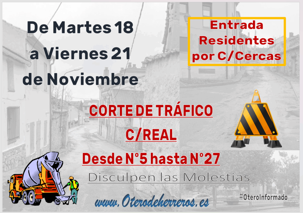 El próximo martes 18 al viernes 21 de Noviembre se va proceder a cortar al tráfico la C/Real para realizar las labores pendientes.