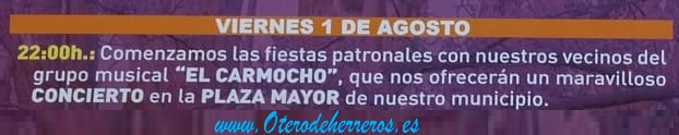 *22:00h.: Comenzaremos las fiestas patronales con nuestros vecinos del grupo musical «EL CARMOCHO», que nos ofrecerán un maravilloso CONCIERTO en la PLAZA MAYOR de nuestro municipio.