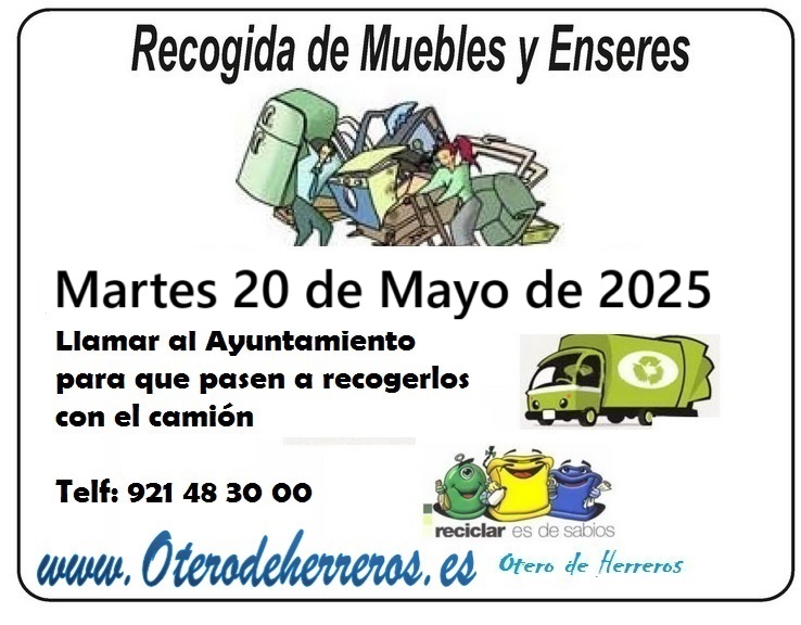 Para usar el servicio de recogida de Enseres, se deberá llamar al Ayuntamiento con antelación indicando que se tiene que retirar y donde. LA RECOGIDA SE REALIZARÁ A LO LARGO DEL DÍA NO DEJAR EN CONTENEDORES NI CALLES POR UN OTERO LIMPIO Y BONITO ¡ESTÁ EN MANOS DE TOD@S! #OteroInformado #OteroRecicla #OteroBonito |