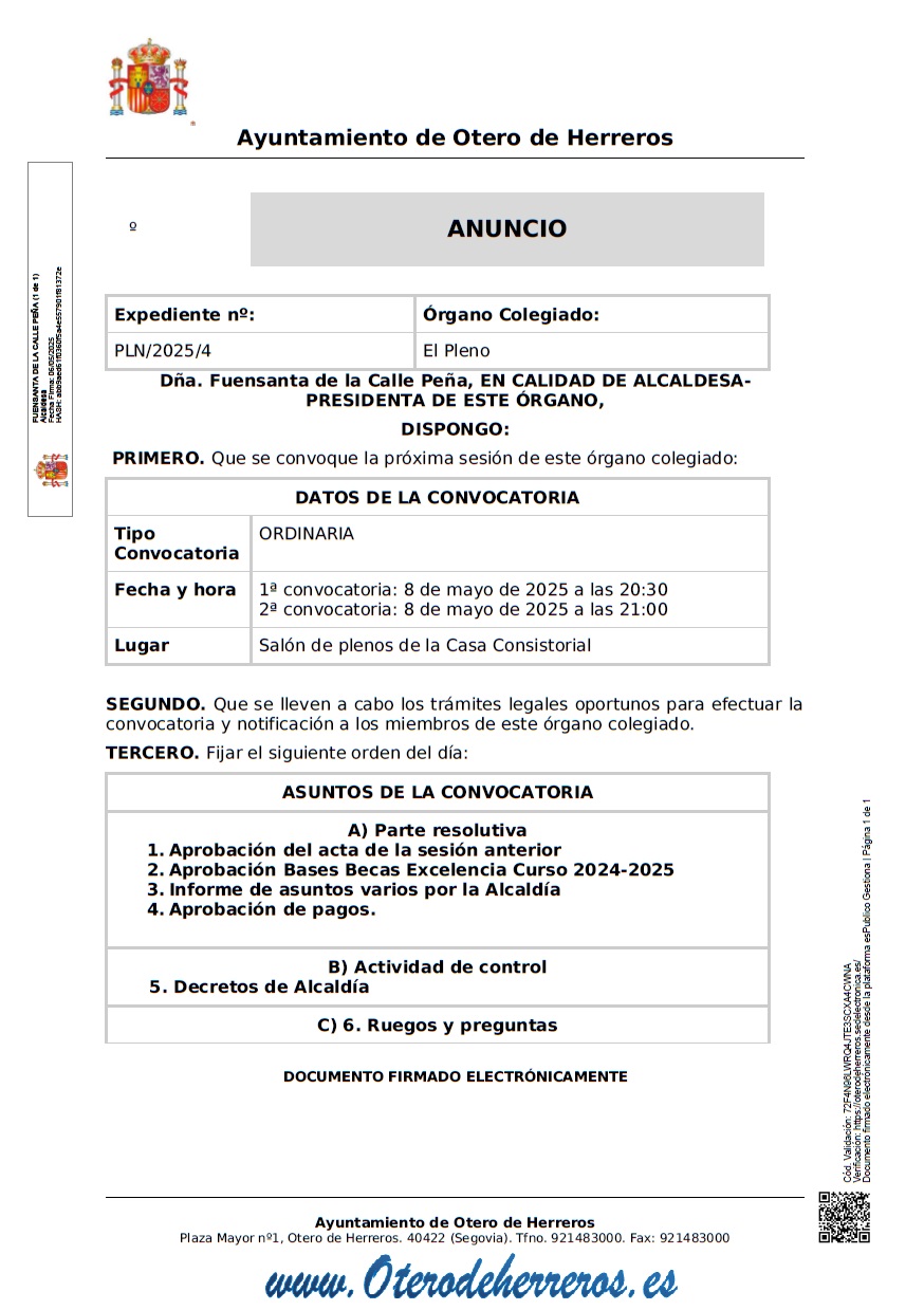 DATOS DE LA CONVOCATORIA Tipo Convocatoria Ordinaria Fecha y hora 1ª convocatoria: 8 de Mayo de 2025 a las 20:30 2ª convocatoria: 8 de Mayo de 2025 a las 21:00 Lugar Salón de plenos de la Casa Consistorial SEGUNDO. Que se lleven a cabo los trámites legales oportunos para efectuar la convocatoria y notificación a ... Leer más |