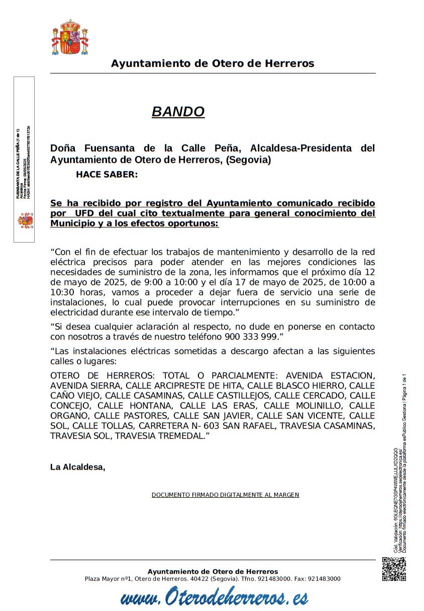 --- Posibles cortes de suministro eléctrico --- El 12 de Mayo de 9:00h a 10:00h y el 17 de Mayo de 10:00h a 10:30h Las zonas afectadas son: Avenida Estación Avenida Sierra Calle Arcipreste de Hita Calle Blasco Hierro Calle Caño Viejo Calle Casaminas Calle Castilejos Calle Cercado Calle Concejo Calle Hontana Calle Las Eras ... Leer más |