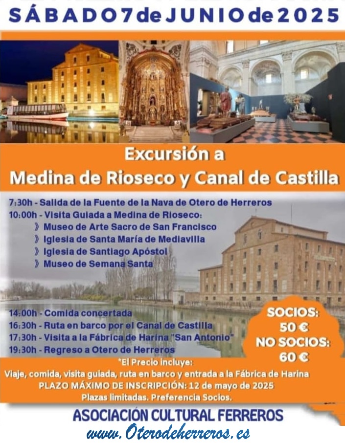 Inscripción hasta el 12 de Mayo. Sábado 7 de Junio excursión a Medina de Rioseco y canal de Castilla. Socios: 50€ No socios: 60€ #OteroInformado #OteroEntretenido