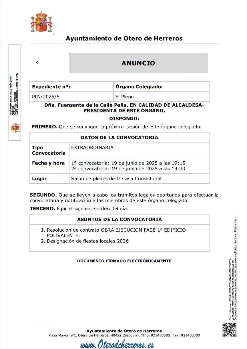 DATOS DE LA CONVOCATORIA Tipo Convocatoria EXTRAORDINARIA Fecha y hora 1ª convocatoria: 19 de Junio de 2025 a las 19:15 2ª convocatoria: 19 de Junio de 2025 a las 19:30 Lugar Salón de plenos de la Casa Consistorial SEGUNDO. Que se lleven a cabo los trámites legales oportunos para efectuar la convocatoria y notificación a ... Leer más |