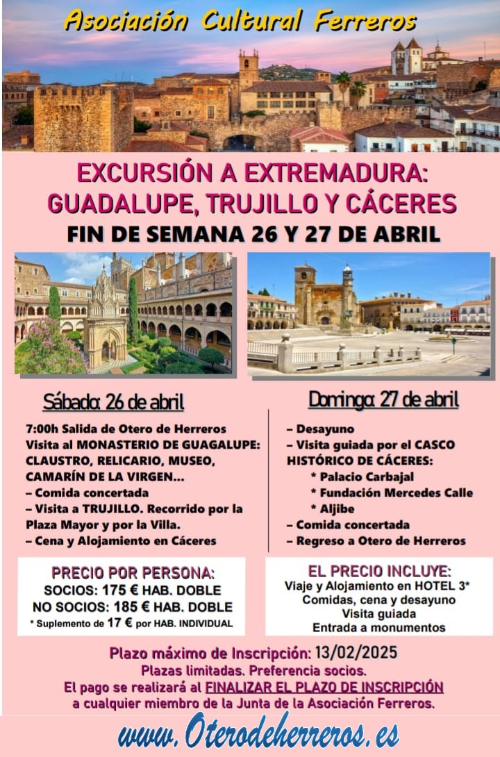 *Último día de Inscripciones 13 de Febrero Actividades OCIO/CULTURAL. en esta ocasión de manos de la Asociación Cultural Ferreros. Con esta Excursión a Extremadura para