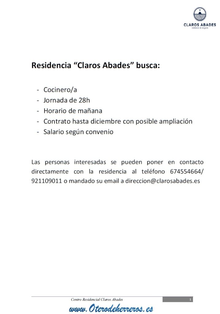 Residencia «Claros Abades» busca Cocinero/a Turno de Mañana