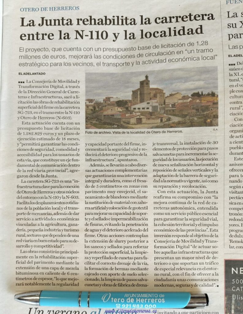 Salimos en el Periódico El Adelantado de Segovia (Jueves 17 de Julio de 2025 La Junta rehabilita la carretera entre la N-110 y la localidad»)